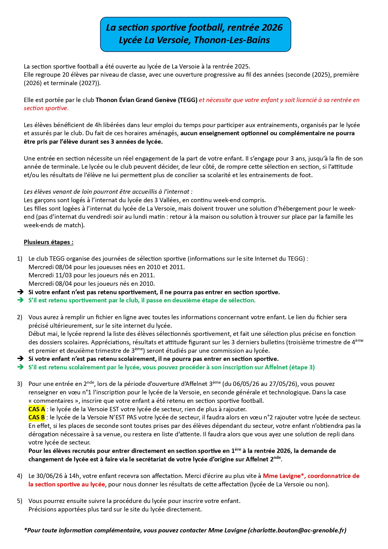 Procédure d'entrée en Section Sportive Football