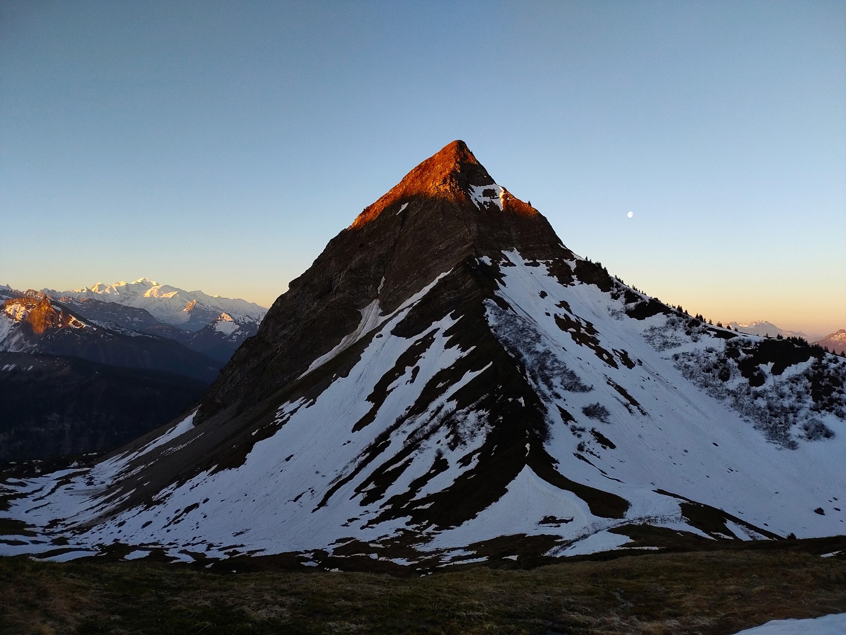 "Depuis le col de Tavaneuse, la Pointe de Nantaux se dresse comme une pyramide. À chaque fois que je traverse le col, j’associe cette idée avec les plus belles pyramides montagnardes : Cervin ou K2 par exemple. Je me souviens alors du livre improbable de Daniel Parrochia « Le cas du K2 », dans lequel l’auteur rapproche mathématiques et montagnes et notamment pour parler des surfaces K3 comme en géométrie algébrique. C’est le mathématicien André Weil qui nomma les surfaces K3 en l’honneur des trois géomètres algébristes Kummer, Kähler et Kodaira, et de la montagne K2 au Karakoram (Pakistan). J’ai choisi cette photo en mettant en valeur la forme pyramidale de la Pointe de Nantaux qui est mon sujet principal. Je voulais aussi que le Mont Blanc apparaisse en arrière-plan alors que la lune vient compléter le tableau. L’heure de la prise de vue était importante puisqu’il fallait que le soleil levant mette en relief le sommet."